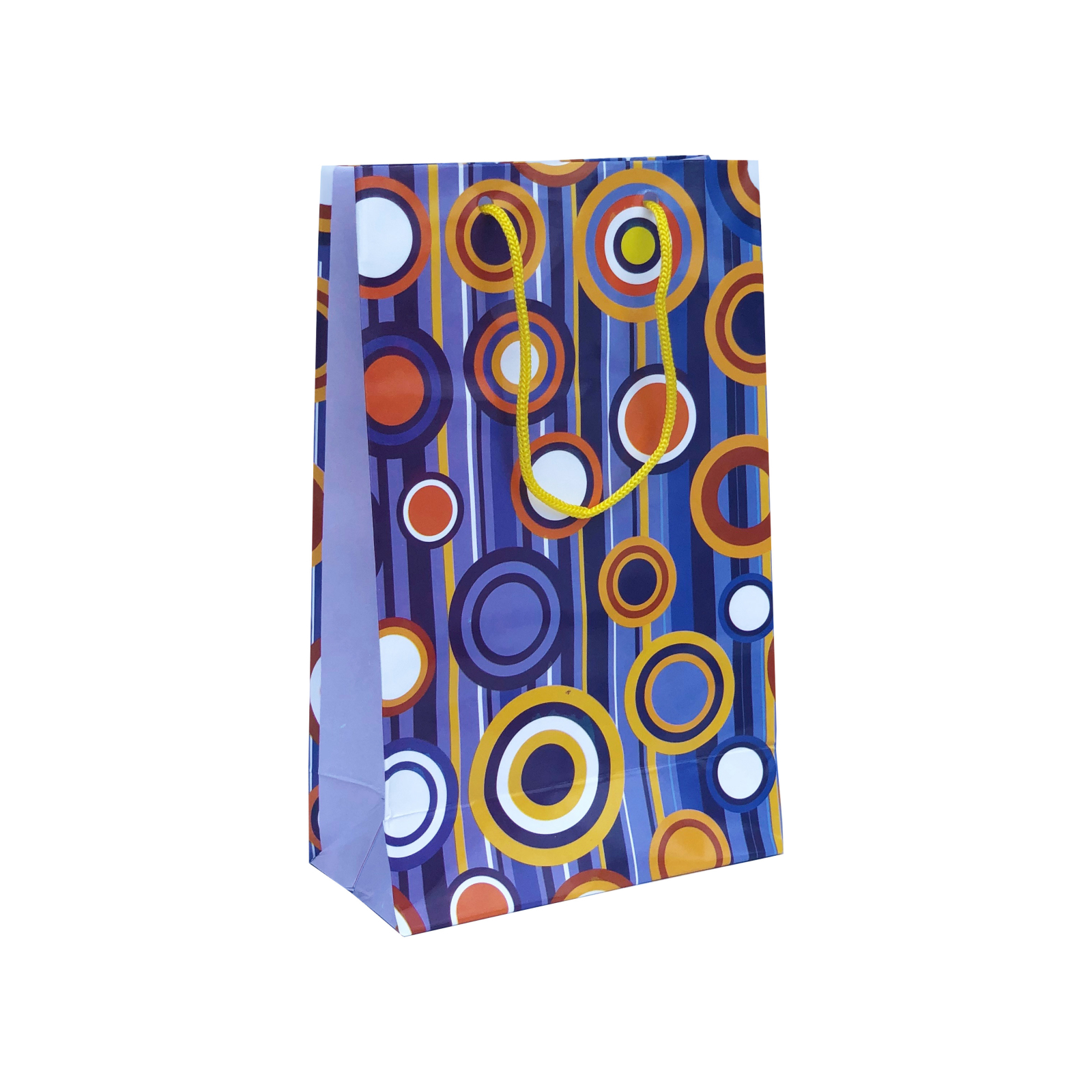 Punga pentru cadouri de dimensiuni medii, din hartie dublu cretata plastifiata si cu intarituri pentru o rezistenta sporita. Modelul pungii este potrivit pentru orice ocazie, avand culori vii si snur textil asortat pentru un plus de eleganta.